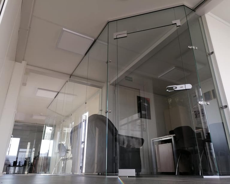 We offer high-quality interior glazing solutions to give your spaces a modern and elegant look. Our products include black fittings, anodised aluminium fittings and sliding frameless door systems with concealed hydraulic strikers for comfortable and gentle automatic door closing without the need for additional drilling or floor cutting. We also offer aluminium-framed checkered partitions that perfectly complement both office and residential interior design.